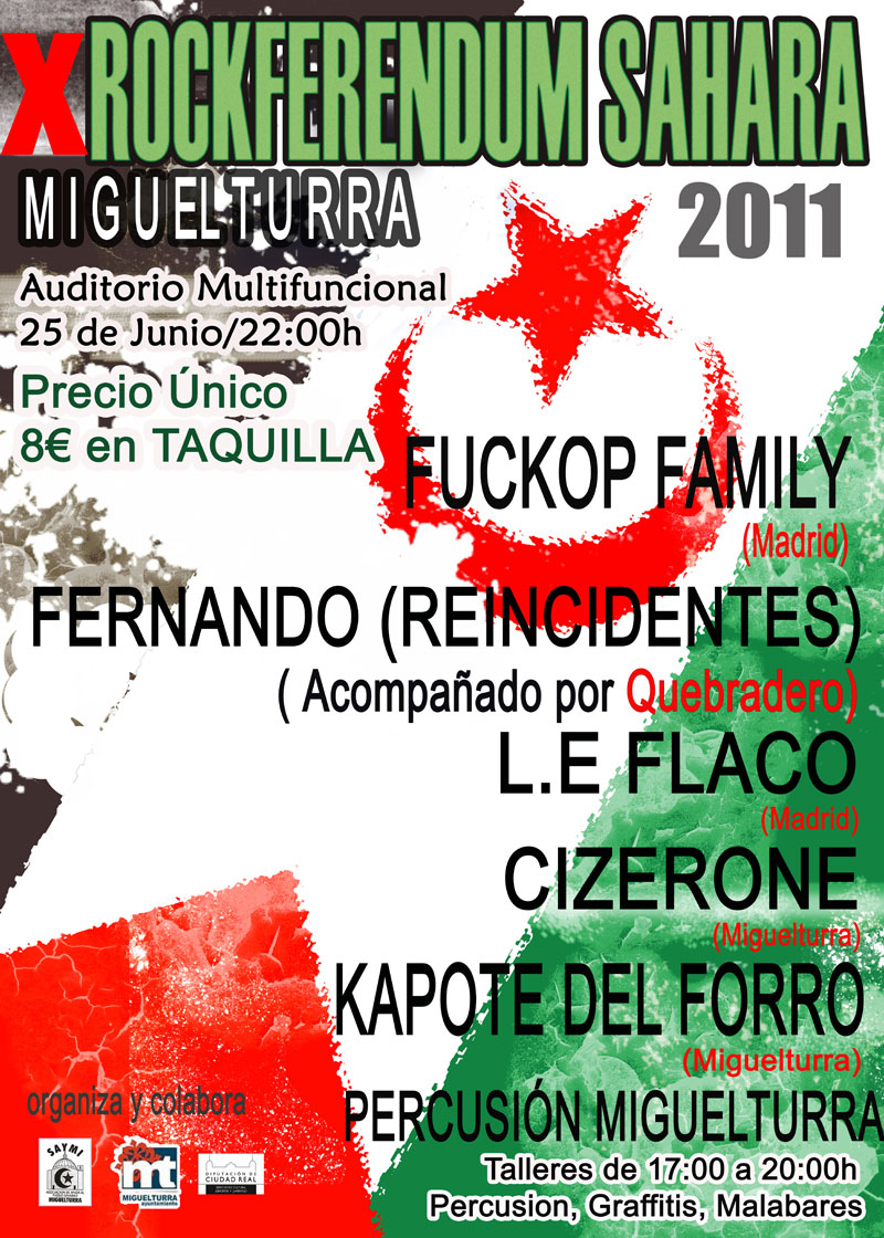 Décimo Festival Benéfico "Rockferendum Sahara 2011", que se desarrollará el sábado, 25 de junio, en el Auditorio Multifuncional de la localidad a partir de las 22:00 horas, organizado por la Asociación local de ayuda al pueblo Saharaui SAYMI y en colaboración con el Ayuntamiento de Miguelturra.