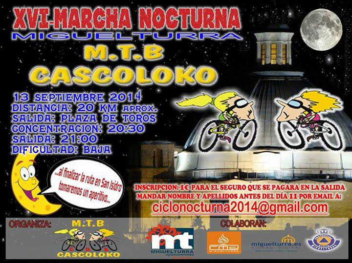 El sábado 13 de septiembre a partir de las 20:30 horas será la fecha en la que se celebrará la Decimosexta Marcha Nocturna MTB Cascoloko, como parte de los eventos deportivos de las Ferias y Fiestas de Miguelturra 2014, organizada por el mencionado club en colaboración con el área de Deportes del Ayuntamiento de Miguelturra, Protección Civil y www.miguelturra.es.