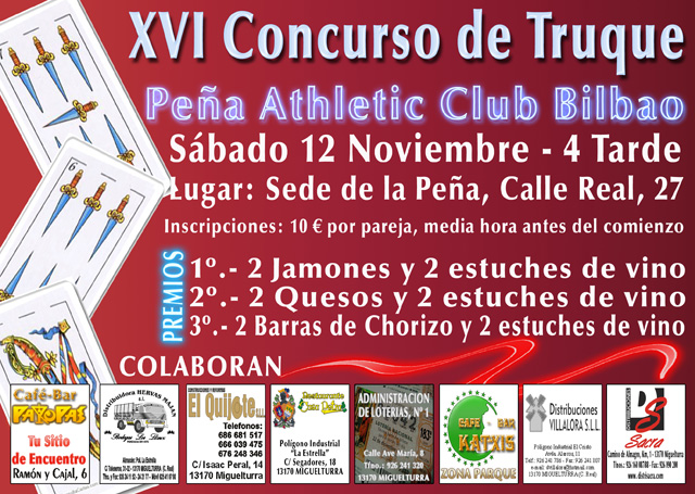 Este sábado 12 de noviembre se celebrará el Decimosexto Concurso de Truque de la Peña del Athlétic Club de Bilbao de Miguelturra, a las 16 horas en la sede de la peña ubicada en la calle Real número 27.