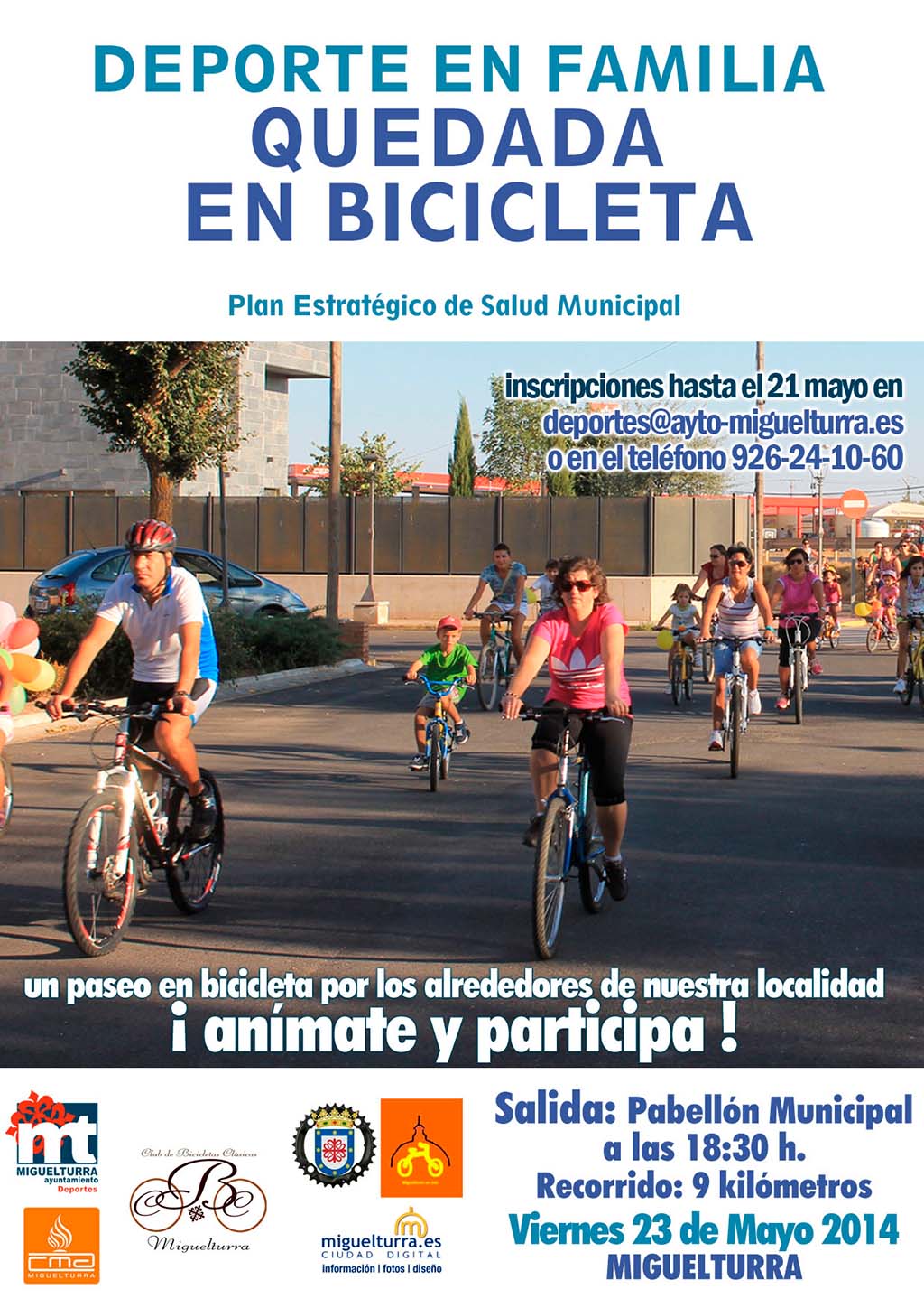 Habrá un periodo de inscripciones hasta el 21 de mayo y que se podrán hacer a través del correo electrónico de la Concejalía de Deportes (deportes@ayto-miguelturra.es) o en el teléfono 926241060. El concejal explica que para ese día habrá agua y avituallamiento para los participantes y que esta actividad se realiza en colaboración con Miguelturra en Bici; con Club de Bicicletas Antiguas, el consejo Municipal de deportes y la Concejalía de Deportes.
