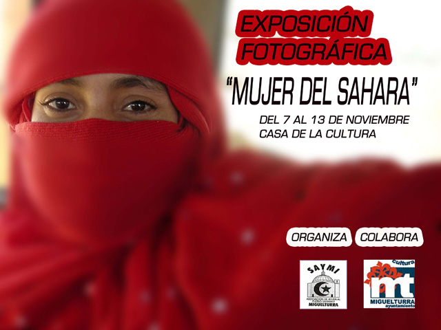 La Casa Cultura inaugura, hoy lunes 7 de noviembre a las 17 horas, la exposición de "Mujeres del Sahara". En esta exposición, que organiza Saymi, asociación miguelturreña de ayuda al pueblo saharaui, con la colaboración del área de Cultura del ayuntamiento de Miguelturra, se van a exponer también fotografías de los proyecto que la ONG ha realizado en estos últimos 4 años en los campamentos como son, la rehabilitación del Hospital de Auserd y de la rehabilitación de edificios públicos llevada a cabo con jóvenes saharauis. Este exposición podrá visitarse hasta el 13 de noviembre.