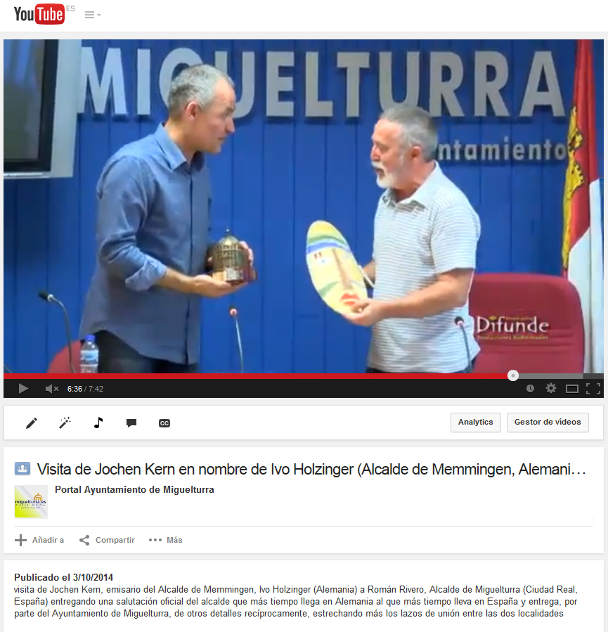 El detalle del alcalde de Memmingen, Ivo Holzinger, al alcalde de Miguelturra, Román Rivero, en Youtube.