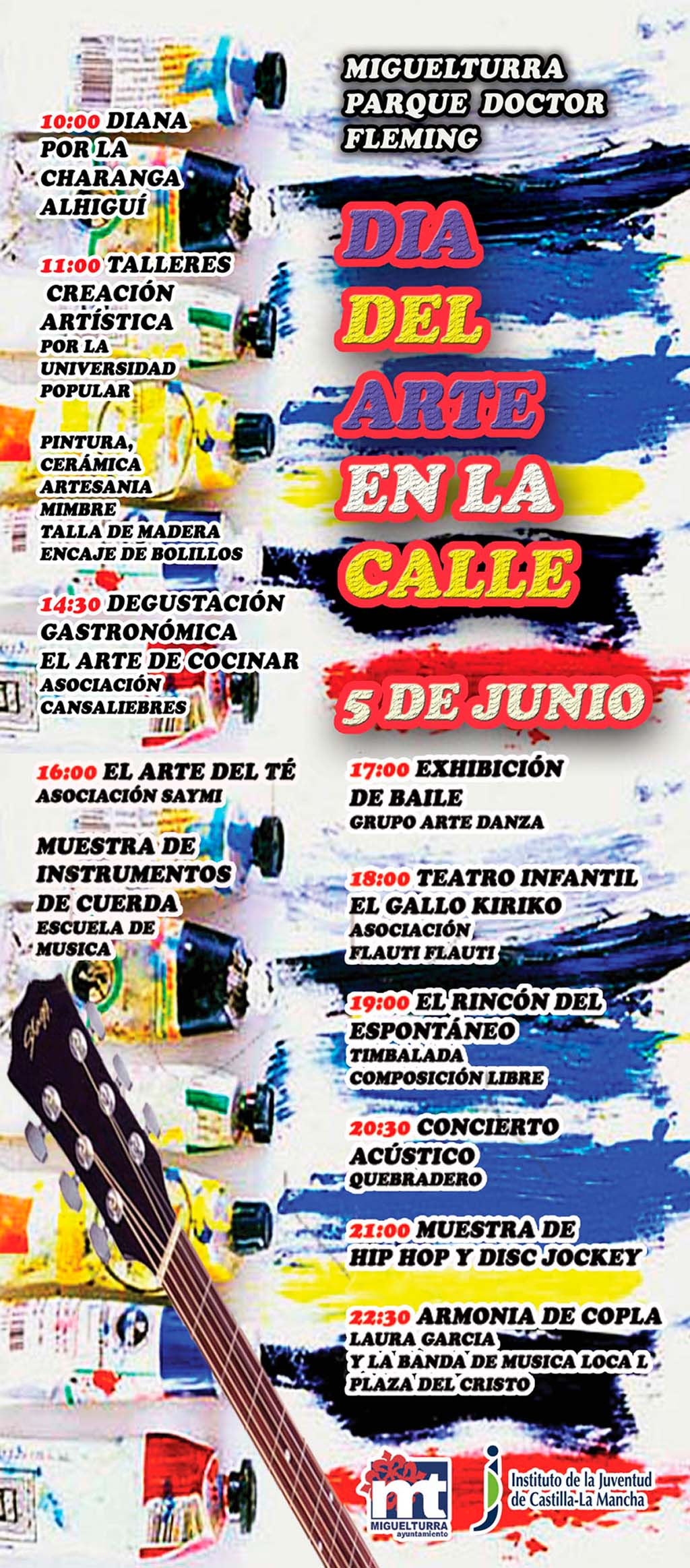 El programa empieza en el parque Doctor Fleming a las diez de la mañana con la "diana" tocada por la charanga Alhiguí, a las 11:00 horas los talleres de creación artística a cargo de la Universidad Popular donde habrá muestras de pintura, cerámica, artesanía, mimbre, talla de madera, y encaje de bolillos.