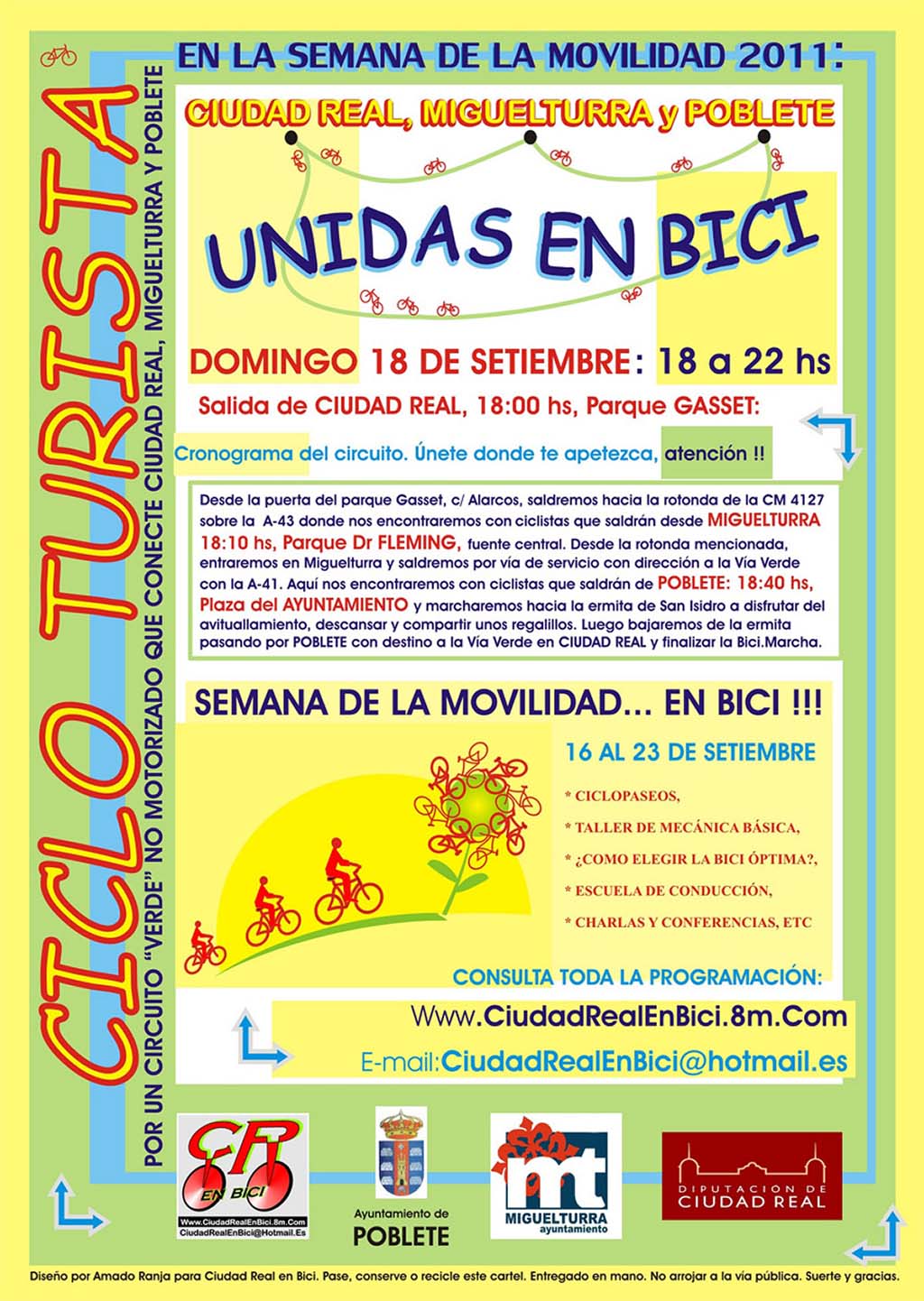 El próximo domingo, 18 de septiembre, tendrá lugar la cicloturista "Unidas en Bici" organizada por los Ayuntamientos de Miguelturra y Poblete, la Diputación Provincial y Ciudad Real en Bici. La ruta discurrirá por un circuito verde no motorizado que conecte las tres localidades: Miguelturra, Ciudad Real y Poblete y está abierta a todos aquellos que quieran participar no solo para disfrutar de una tarde entretenida sino también para ayudar a fomentar la concienciación sobre el cuidado del medio ambiente.