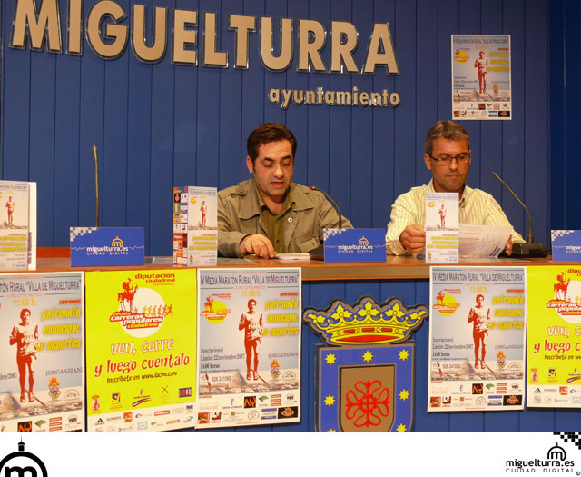 El concejal de deportes, Manuel Viso, y el directivo del club fondistas de Miguelturra, Marcial González han presentado la cuarta edición de la Media Maratón de Miguelturra que se celebrará el próximo domingo 25 a las 11:00 h de la mañana y que dará comienzo en el Estadio Municipal, donde también está establecida la llegada. La principal característica de esta carrera es que se desarrolla en un circuito mixto predominantemente rural, ya que de los 21,098 Kms 17 serán por caminos sin asfaltar y el resto por circuito urbano. Se concederá un tiempo máximo de 2 horas y 30 minutos para su finalización.