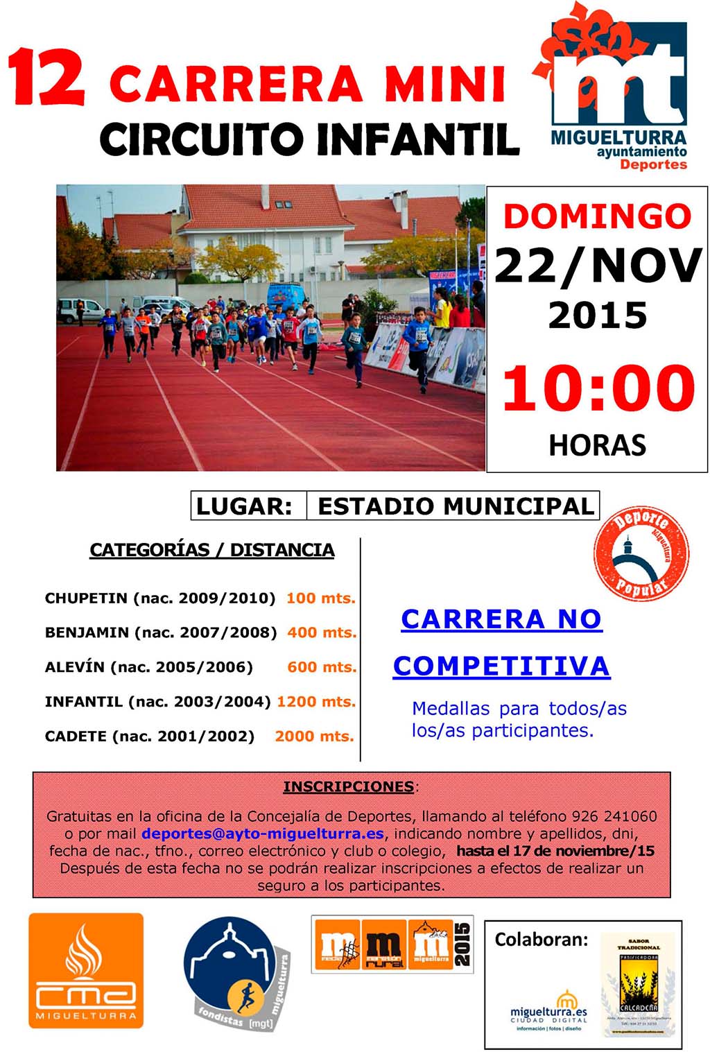 La Concejalía de Deportes del Ayuntamiento de Miguelturra informa del comienzo de inscripciones para participar en la "Carrera Mini" que se desarrolla, como ya es tradicional, el mismo día de la Media Maratón Rural Villa Miguelturra, ambas englobadas dentro del programa "Deporte Popular", carrera mini que cumple su duodécima edición y en colaboración con la asociación local Fondistas de Miguelturra y Panificadora Calcadeña.