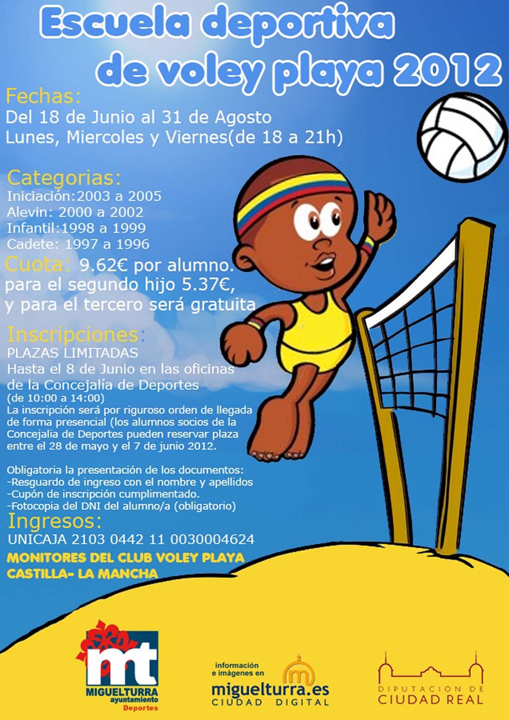 La Concejalía de Deportes de Miguelturra oferta para este verano una Escuela Deportiva Voley playa del 18 de junio al 31 de agosto en colaboración Diputación de Ciudad Real, y www.miguelturra.es Ciudad Digital que colabora en cuanto a difusión de información e imágenes, e impartida por monitores-as del Club Voley Playa de Castilla La Mancha.