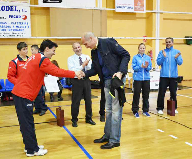 Información completa de la imagen anexa a esta noticia: En la foto están Jesús Ramal y Suvi fondo derecha, por un lado y Eduardo Zurita (concejal de deportes) y Miguel Ángel López (entrenador de kim Miguelturra), por otro en primer plano.