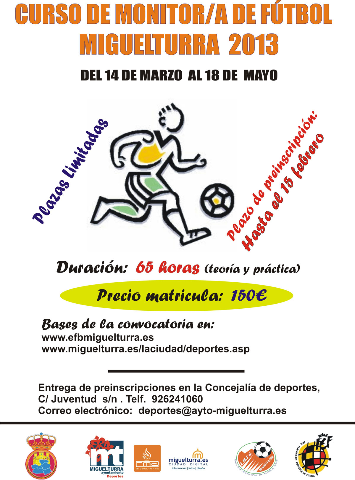 La Federación Territorial de Castilla- La Mancha convoca un curso de monitor-a de fútbol, en colaboración con el Consejo Municipal de Deportes, la Escuela Municipal de Fútbol Base y el Área de Deportes del Ayuntamiento de Miguelturra, a celebrarse en Miguelturra entre el 14 de marzo y 18 de mayo.