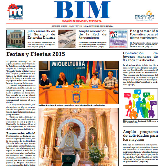 La portada de este mes de septiembre de 2015 destaca el los eventos más relevantes de las Ferias y Fiestas 2015 cuya información está saliendo prácticamente en estas fechas, además de la gran actividad de talleres del Servicio de Estancias Diurnas, la renovación de la red de saneamiento municipal, la Programación Formativa del último cuatrimestre del año e información sobre el Plan de Empleo Municipal cuyo plazo termina el 4 de septiembre, acaparan en esta ocasión la portada del Boletín Informativo Municipal, más conocido como BIM, no sin antes invitarles que consulten sus páginas interiores donde también se da la información completa sobre el nuevo curso de la Universidad Popular de Miguelturra, las Escuelas Deportivas y La Escuela de Música, entre otras informaciones.