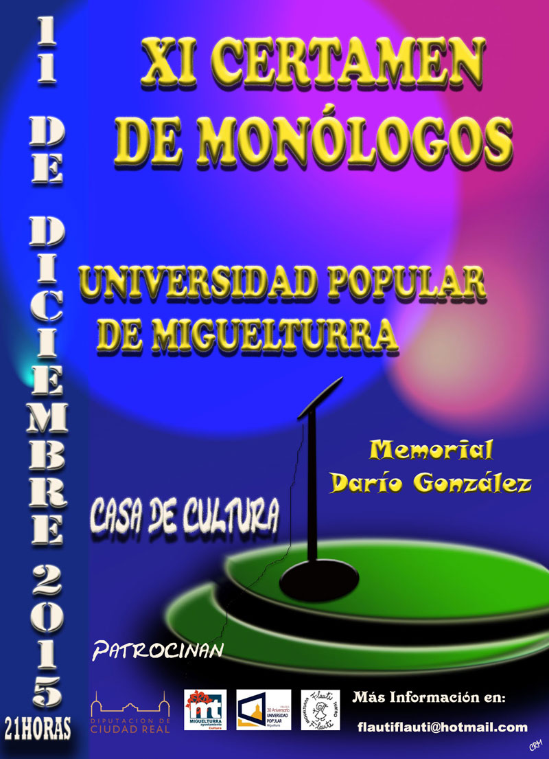 Pasada la década, llega el decimoprimero "Certamen de Monólogos de la Universidad Popular de Miguelturra" que, organizado por la Universidad Popular de la localidad, con la colaboración del grupo de teatro "Flauti Flauti" y que rinde homenaje al miguelturreño Darío González, evento que se desarrollará el viernes 11 de diciembre a partir de las 21 horas en la Casa de la Cultura.