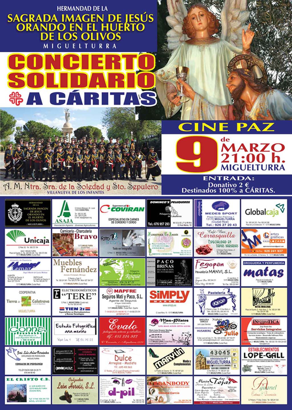 La Hermandad De La Sagrada Imagen de Jesús Orando en el Huerto De Los Olivos de Miguelturra organiza un Concierto Solidario, en el que toda la recaudación de dicho evento será para Cáritas Miguelturra, para ayudar a todas las personas más necesitadas de la localidad.