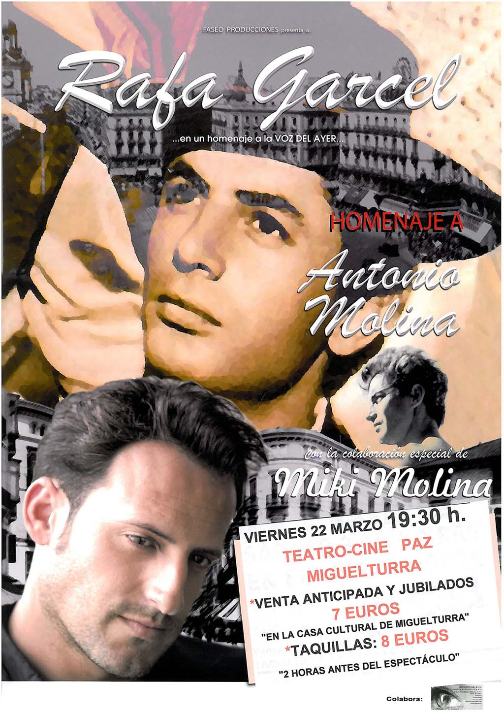 La tarde del viernes 22 de marzo a partir de las 19:30 horas en el Teatro Cine Paz de Miguelturra los aficionados a Antonio Molina podrán disfrutar de un homenaje al cantante a través de la maravillosa voz de Rafa Garcel, patrocinado por la Concejalía de Cultura del Ayuntamiento de Miguelturra.