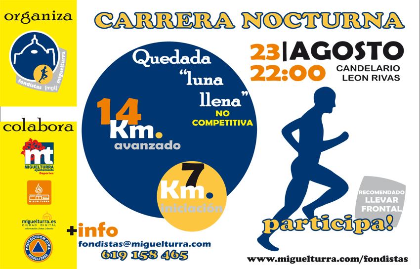 Esta carrera organizada por el club fondista de miguelturra en colaboración con el ayuntamiento a través de la Concejalía de Deportes, www.miguelturra.es y protección civil se celebrará a partir de las 22.00 horas comenzando en el Candelario León Rivas.