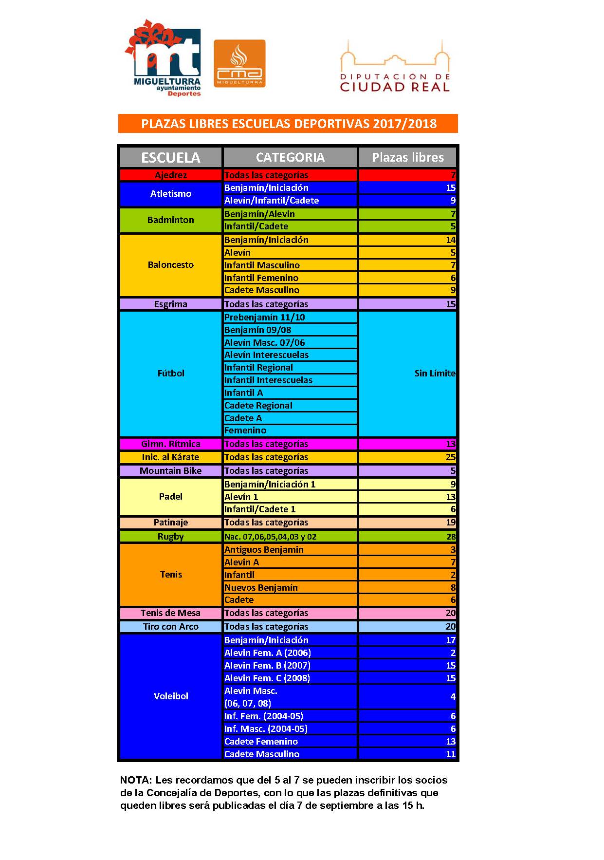 El área de Deportes da a conocer el listado de plazas libres disponibles para las Escuelas Deportivas del curso 2017-2018 una vez finalizado el plazo que ha estado vigente estos pasados días para la matriculación de alumnado ya inscrito anteriormente.