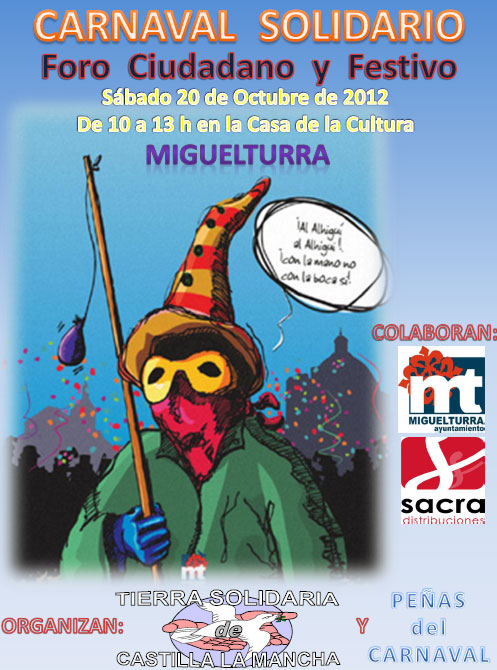 Por eso, Tierra Solidaria de Castilla La Mancha convoca a la población miguelturreña para reactivar la realización del Monumento al Carnaval con fines solidarios que según comenta Mora ya conocían los mayores del pueblo "visitando a los mayores del pueblo con la idea, nos contaron que hace ya más de 15 años que el miguelturreño Octavio Martín Muñoz plasmaba este clamor popular al final de una de sus coplas":