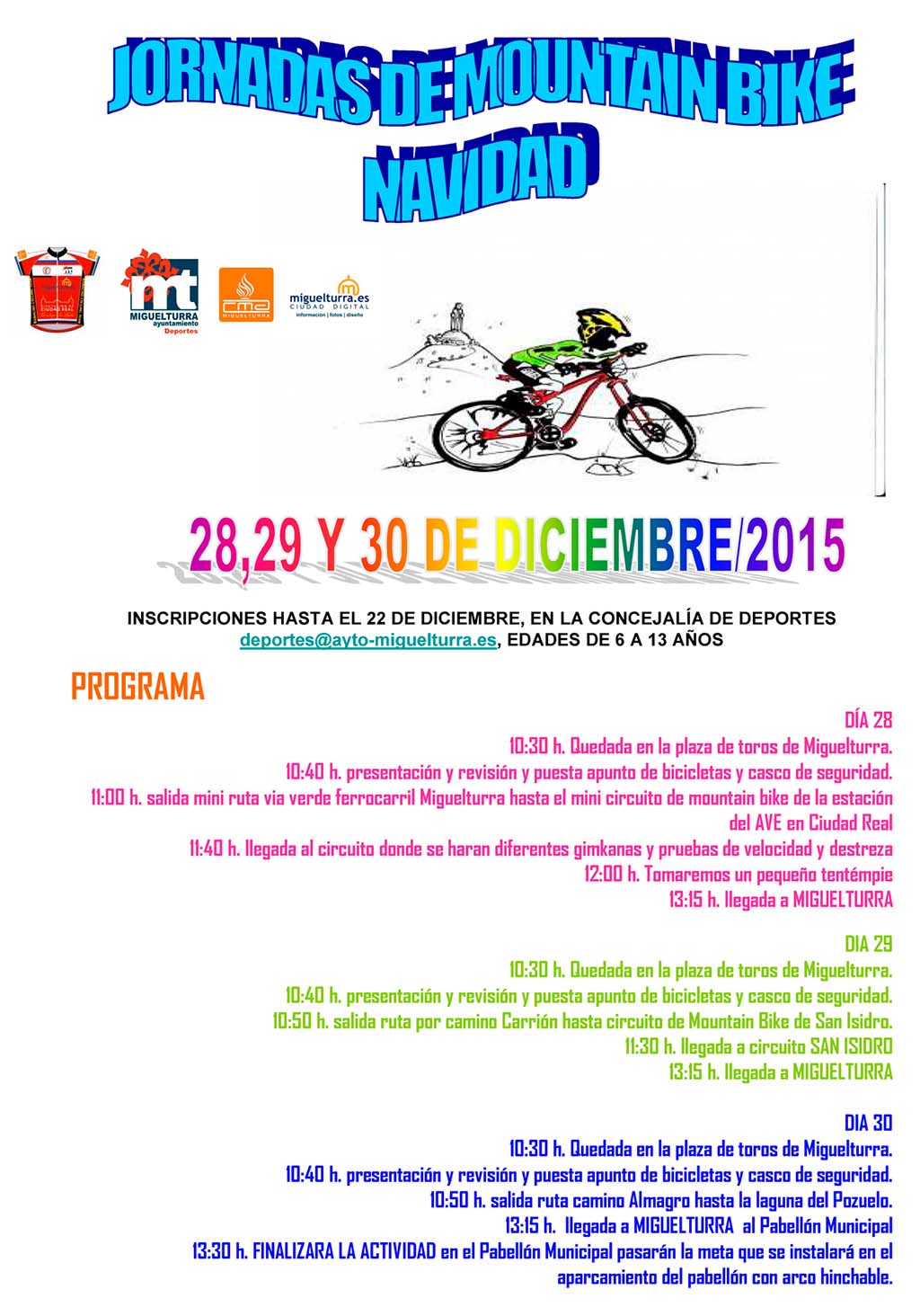 Dentro de la Programación de Navidad del Ayuntamiento de Miguelturra, que va desde el 3 de diciembre al 9 de enero de 2016, se desarrollarán los días 28, 29 y 30 de diciembre las Jornadas de Navidad de Mountain Bike, organizado por la Escuela Deportiva de Mountain Bike y la Concejalía de Deportes del consistorio, para jóvenes de 6 a 13 años de edad.