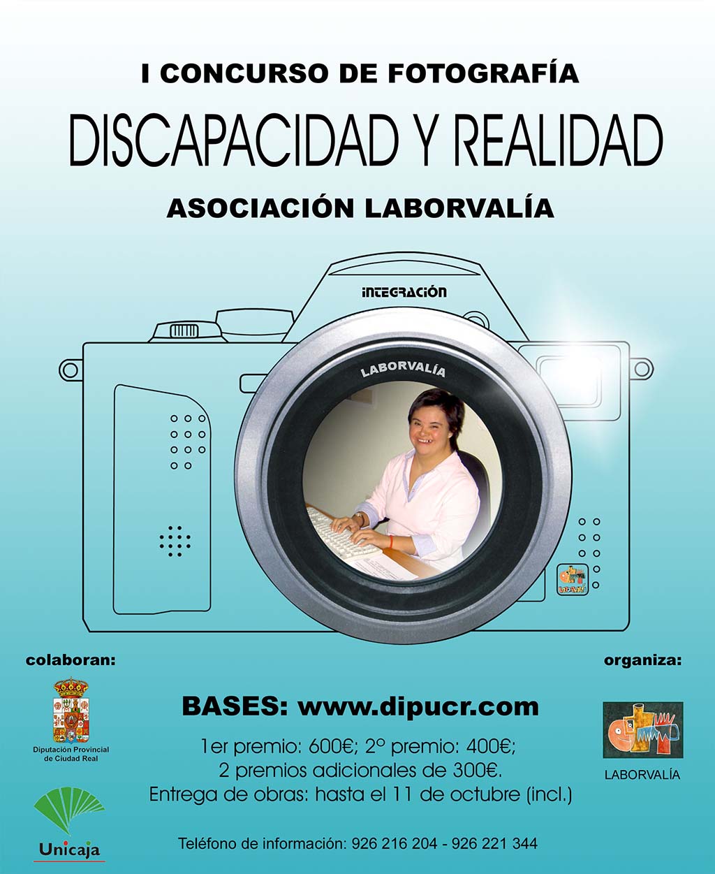 La Asociación para la promoción socio-laboral de las personas con discapacidad psíquica LABORVALÍA, convoca la I Edición del Concurso de Fotografía denominado REALIDAD Y DISCAPACIDAD abierto a cualquier persona jurídica o física, y pudiendo presentar obras hasta el 11 de octubre, con ello www.miguelturra.es, no sólo es accesible sino que colabora en la difusión de éste o cualquier proyecto que, orientado al colectivo de discapacitados, pueda mostrar de una forma más humana todos aquellos acontecimientos, eventos, acciones formativas, o como en este caso, certámenes, que nos acerquen a todos estas realidades.