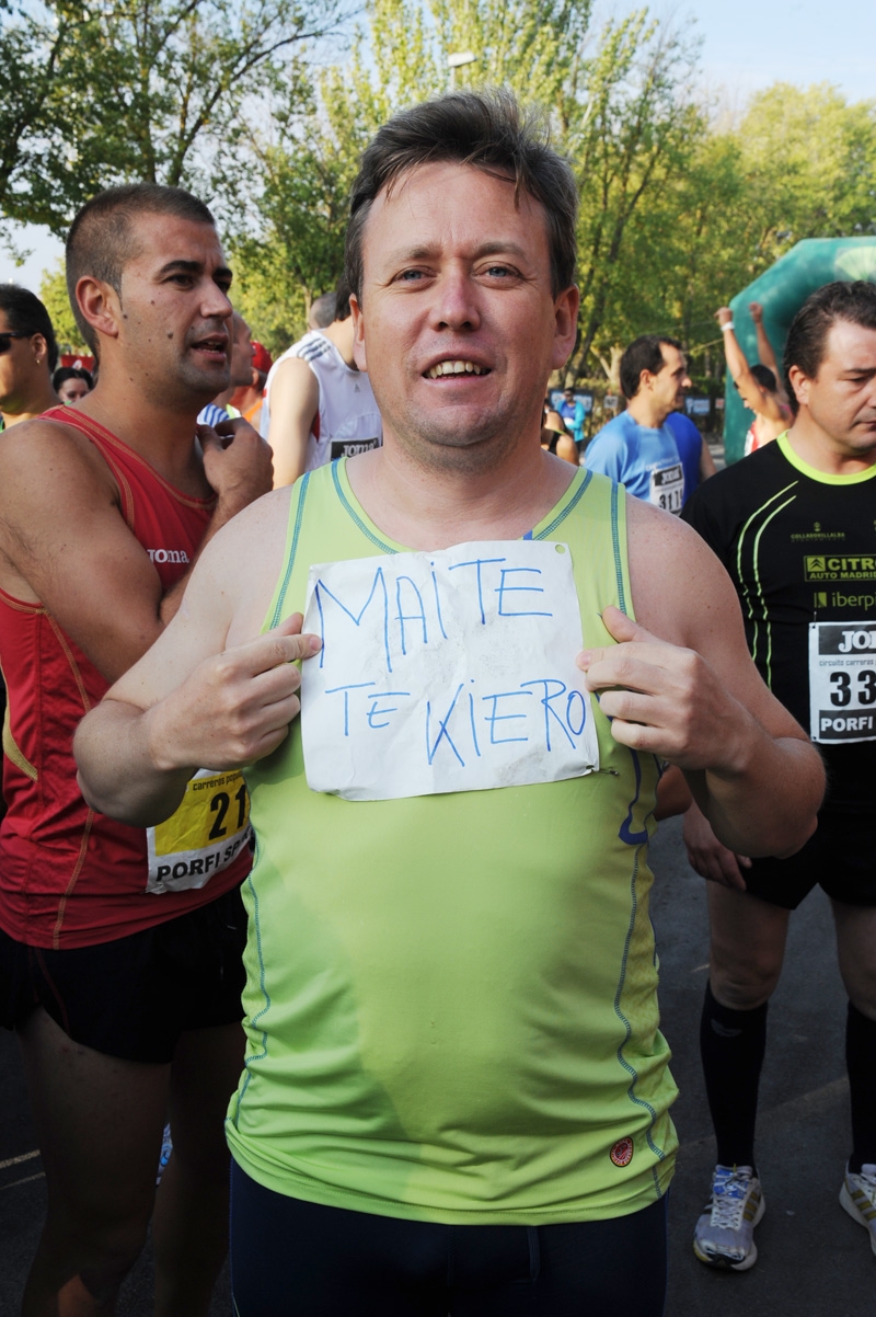 Sin duda este miguelturreño se desplazó casi 100 kilómetros de su lugar habitual de residencia para disputar una carrera en Alcázar de San Juan, en este caso una media maratón. Y lo hizo no sólo para participar en ella, sino también para enviar un mensaje, a su pareja en este caso, con una simple hoja de papel ante el fotógrafo que realiza el reportaje de cada una de las carreras que componen el Circuito de Carreras de Ciudad Real.