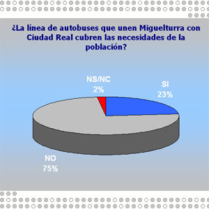 En la encuesta que ha estado activa desde el 02/09/2005 al 18/09/2005 en la portada de la web municipal, dependiente del Área de Nuevas Tecnologías del Ayuntamiento de Miguelturra, www.miguelturra.es, se refleja que 63 votos que opinan un SI, frente a un mayoritario 203 que opinan un NO, y unos inapreciables 5 NO SABEN NO CONTESTAN; por lo tanto es evidente, si tomamos en cuenta este muestreo de resultados, que los autobuses interurbanos que comunican nuestra población con la capital ciudadrealeña, no cubren la necesidades de la población.