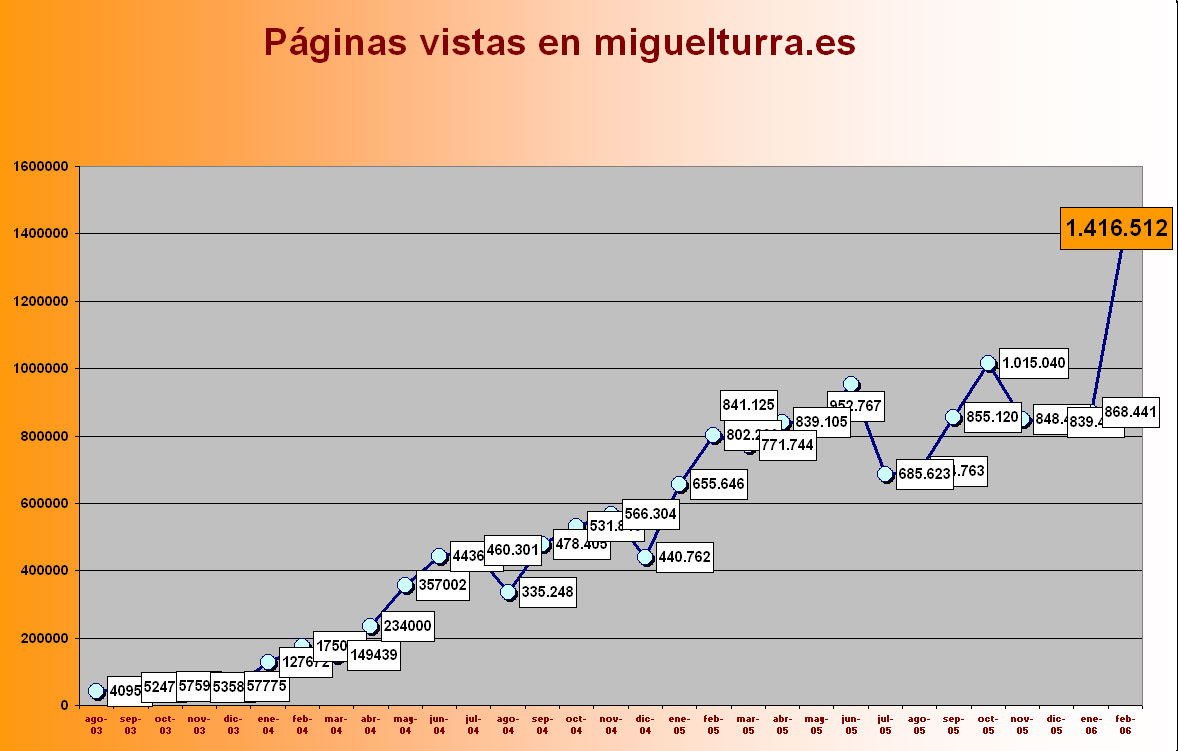 Con los datos extraídos de la estadística del pasado febrero, la web oficial del Ayuntamiento de Miguelturra se confirma como un potente referente de consulta no sólo para los miguelturreños, avalando así el Premio regional a la Excelencia y Calidad de los Servicios Públicos recientemente recibido. A lo largo del pasado mes un millón y medio de páginas fueron vistas en Miguelturra.es, lo que viene a superar notablemente los anteriores registros de la web -el techo anterior data de noviembre de 2005, con un millón de páginas abiertas.