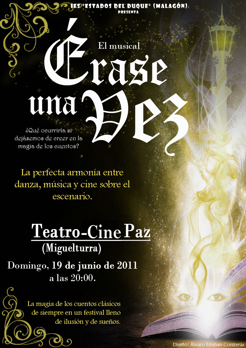 El Área de Cultura del Ayuntamiento de Miguelturra informa sobre la puesta en escena del musical del Instituto de Enseñanza Secundaria Estados del Duque, de la localidad ciudadrealeña de Malagón, titulada "Érase una vez" (¿qué ocurriría si dejásemos de creer en la magia de los cuentos?) el próximo domingo 19 de junio a partir de las 20:00 horas y con un precio de 3 euros por persona en el Teatro Cine Paz de nuestra localidad, obra musical que se representa en colaboración con el área de cultura municipal de Miguelturra.