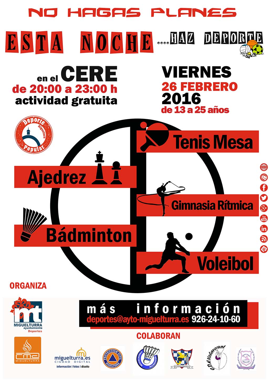 El viernes 26 de febrero entre las 20:00 y las 23:00 horas se volverá a desarrollar en el CERE una nueva edición del programa "No hagas planes, esta noche… haz deporte", organizado por la Concejalía de Deportes del Ayuntamiento de Miguelturra, en colaboración con Protección Civil, Club de Bádminton de Miguelturra, Club Deportivo Volaverunt, Club de Tenis de Miguelturra, ADV Miguelturra y el portal web municipal www.miguelturra.es, y dentro del programa "Deporte Popular".