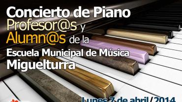 Cultura Concierto de piano del alumnado y profesorado de la Escuela de Música Municipal. Lun, 07/04/2014 - 02:00 - Mar, 08/04/2014 - 02:00