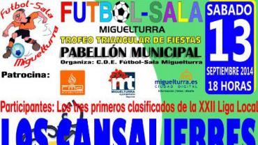 Deportes Triangular de Fútbol Sala especial Ferias y Fiestas de Miguelturra 2014. Sábado 13 de septiembre entre las 18:00 y las 21:00 horas en el Pabellón Municipal de Deportes.