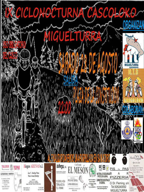 El próximo sábado 28 de agosto, se celebra en Miguelturra la novena ciclonocturna Cascoloko Miguelturra, organizada por el Área de Juventud del Ayuntamiento de Miguelturra y M.T.B Cascoloko. La salida tendrá lugar en la plaza de la Constitución a las 22 horas, y se informa a todos los participantes que es obligatorio el uso del casco. Por último, cuando finalice el evento darán una parrillada en la ermita de San Isidro.
