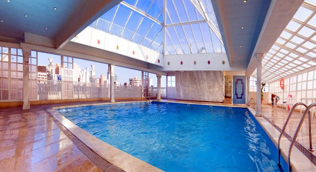 El hotel, en su página web, indica que todas las habitaciones son estándar y disponen de frigorífico, aire acondicionado, T.V. color vía satélite y canal vídeo. Cama matrimonio o dos camas, baño completo y teléfono directo. Además dispone de dos restaurantes, grill, terraza, varios salones, sala de congresos, televisión, aire acondicionado, terraza-piscina en séptima planta, solarium neoclásico romano, gimnasio, jacuzzi. Bowling Green, tiro con arco, carabina, ping-pong y juegos varios. Este hotel está situado en el corazón del casco antiguo de Benidorm, con vistas al parque de L Aigüera y a 500 metros de la famosa playa de Levante (de arena).