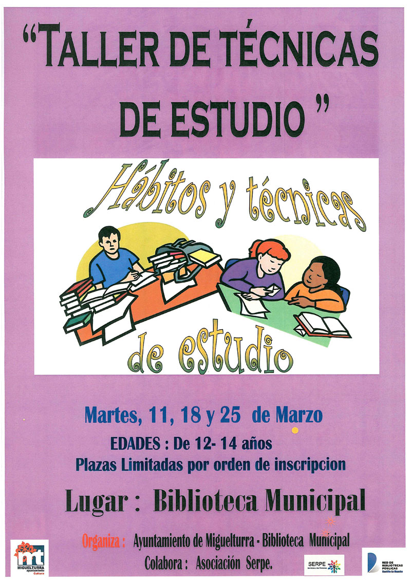 La Biblioteca Municipal de Miguelturra, en colaboración con la Asociación Serpe, organiza un Taller de Técnicas de Estudio para fomentar las técnicas y los hábitos a la hora de estudiar.