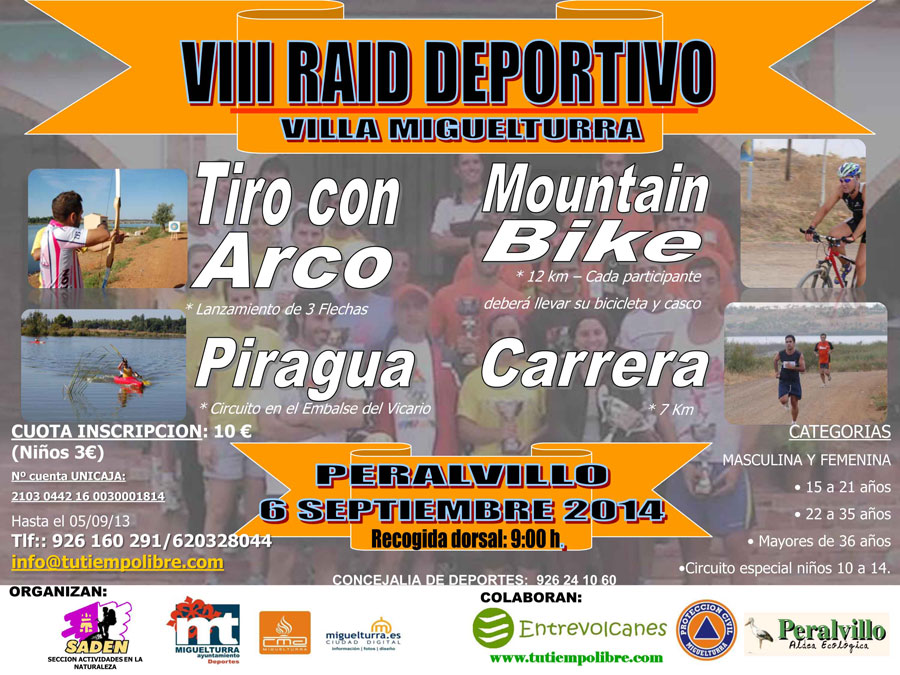 El Club SADEN, con el patrocinio de la Concejalía de Deportes del Ayuntamiento de Miguelturra, y el asesoramiento y apoyo logístico de Entrevolcanes, Protección Civil de Miguelturra y Peralvillo Aldea Ecológica, pone en marcha el Octavo Raid Deportivo Villa de Miguelturra, que tendrá lugar el 6 de septiembre en la pedanía miguelturreña.