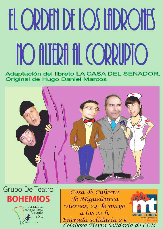 La Concejalía de Cultura del ayuntamiento de Miguelturra presenta la obra de teatro "El orden de los ladrones no altera al corrupto", que será puesta en escena el próximo viernes, día 24 de mayo, a cargo del grupo de teatro "Bohemios".