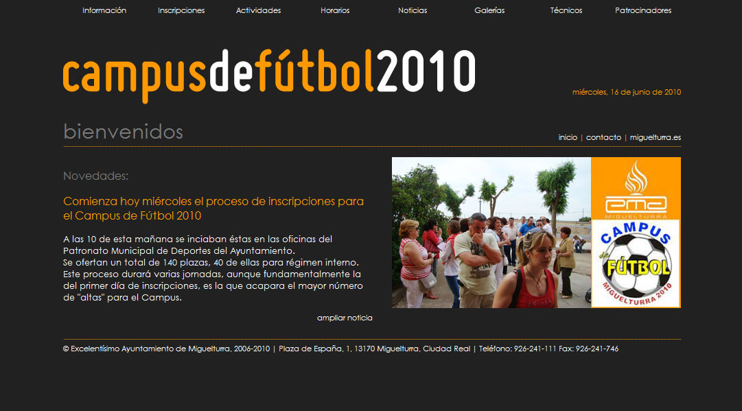 Asimismo, comunicamos la presentación oficial de la web del Campus 2010, donde pueden encontrar toda la información sobre inscripciones, cuotas, formalización de las inscripciones y descarga del modelo de solicitud, horarios, actividades, equipo técnico del Campus, y las noticias que se han producido y se produzcan día a día, además de las galerías de fotos que ya existen a su disposición.