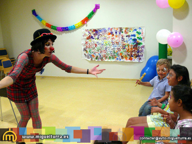 La compañía de payasos cianuro ha sido la encargada de poner la sonrisa en la boca durante hora y media a loa niños del taller de ocio en verano con discapacitados dirigido a niños y niñas con edades comprendidas entre los 4 y 15 años.
