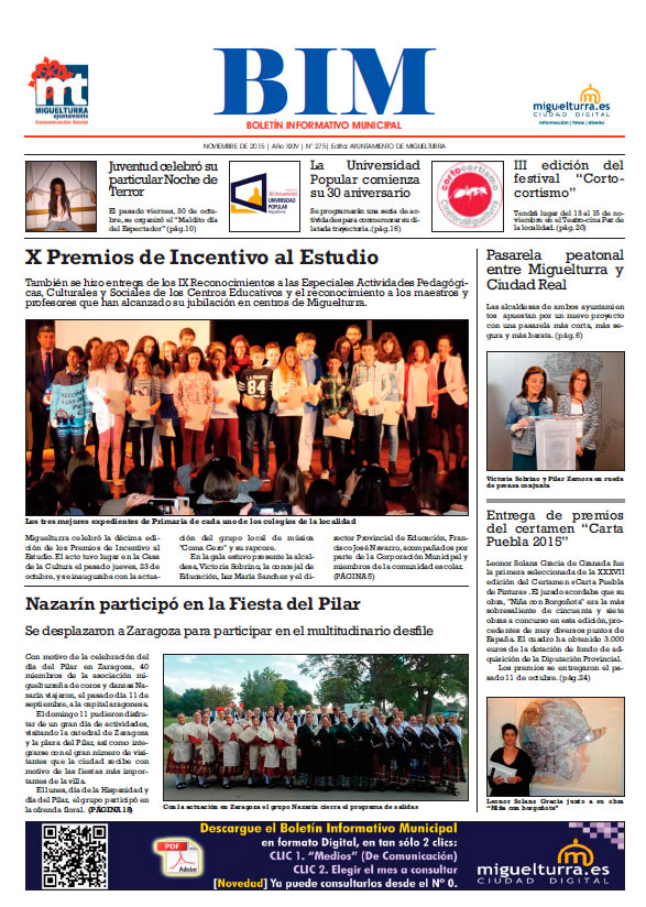 El Boletín Informativo Municipal número 275 ya puede consultarlo desde el martes 3 de noviembre de 2015 a través del portal municipal en formato PDF, periódico que también se distribuye y buzonea en muchos hogares de Miguelturra, BIM elaborado por el Área de Cultura del consistorio mes a mes y desde hace un buen número de años.