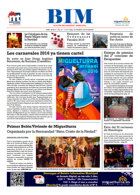 El Boletín Informativo Municipal de Miguelturra de enero de 2016, más conocido como BIM, número 277, da a conocer en su portada como noticia más destacada el cartel oficial anunciador de los Carnavales de Miguelturra de este año, que están prácticamente a las puertas, creación original de Juan Diego Ingelmo Benavente, de la localidad castellonense de Burriana.