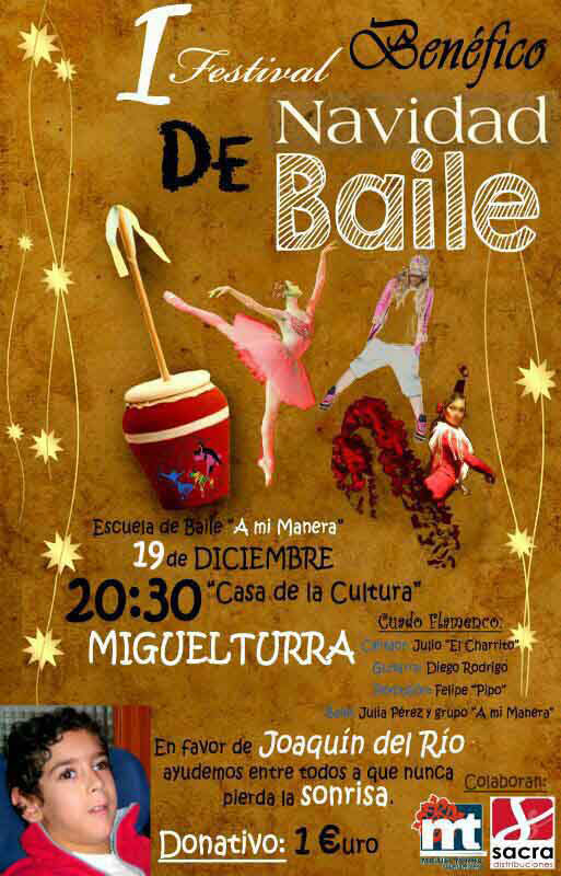 Tal y como explica la directora de la academia Julia Pérez "la entrada y una rifa que se hará de una cesta cedida por distribuciones Sacra irá destinada íntegramente a Joaquín que necesita una silla adaptada más grande y que cubra sus necesitases" por tanto anima todo el mundo a pasarse por la Casa de Cultura para disfrutar del baile de las niñas y además colaborar con una buena causa.
