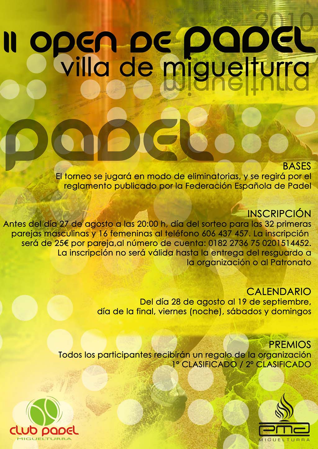 El Patronato de Deportes del Ayuntamiento de Miguelturra realiza durante estas fechas y hasta el 27 de agosto el proceso de inscripción para participar en el Segundo Open de Pádel "Villa de Miguelturra" que se celebrará con motivo de las Ferias y Fiestas Patronales, desde el 28 de agosto al 19 de septiembre.