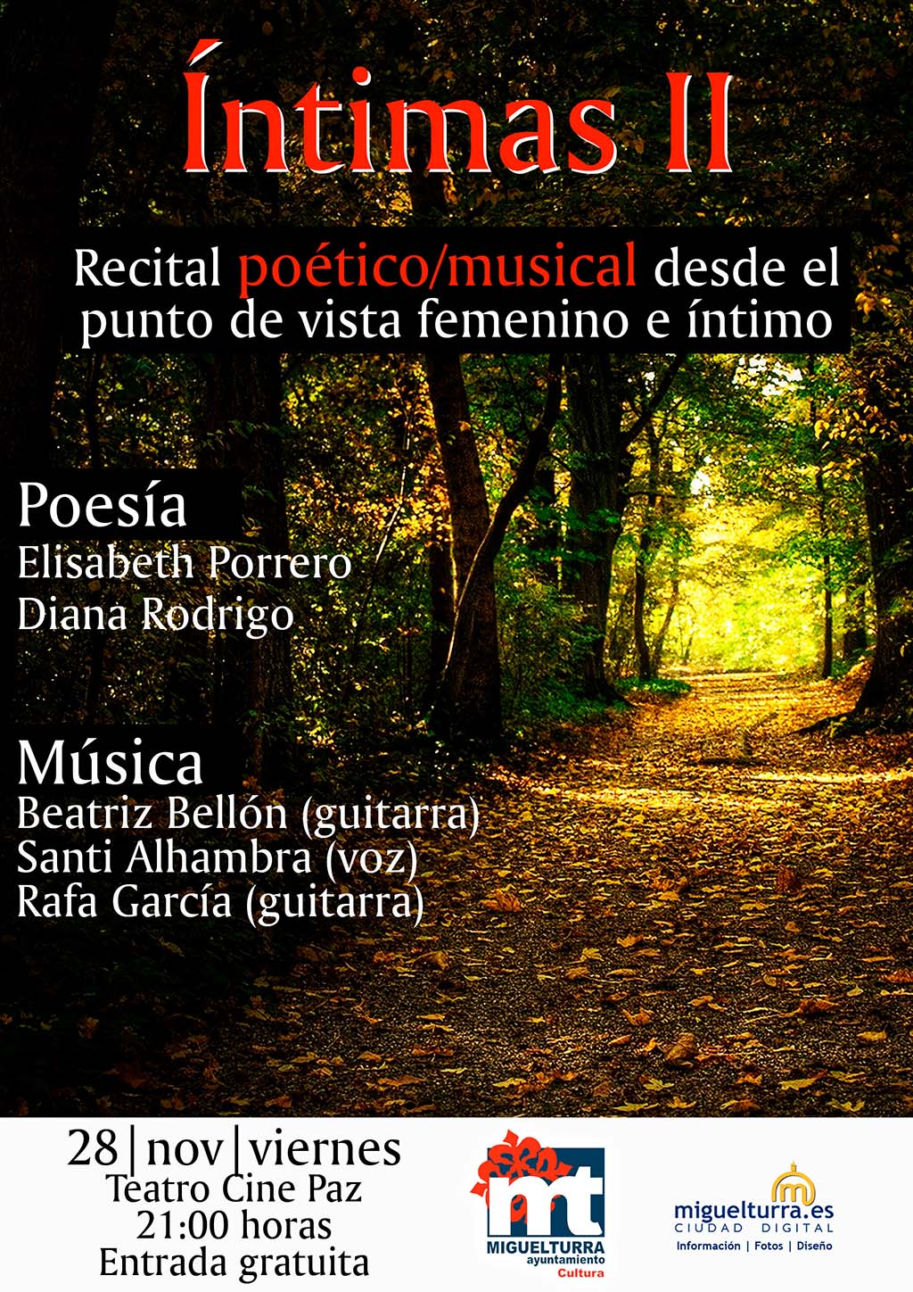 En él intervendrán Elisabeth Porrero y Diana Rodrigo en la parte poética. En la parte musical colaboran Rafa García y Beatriz Bellón, ambos a la guitarra, y Santi Alhambra, en la voz.