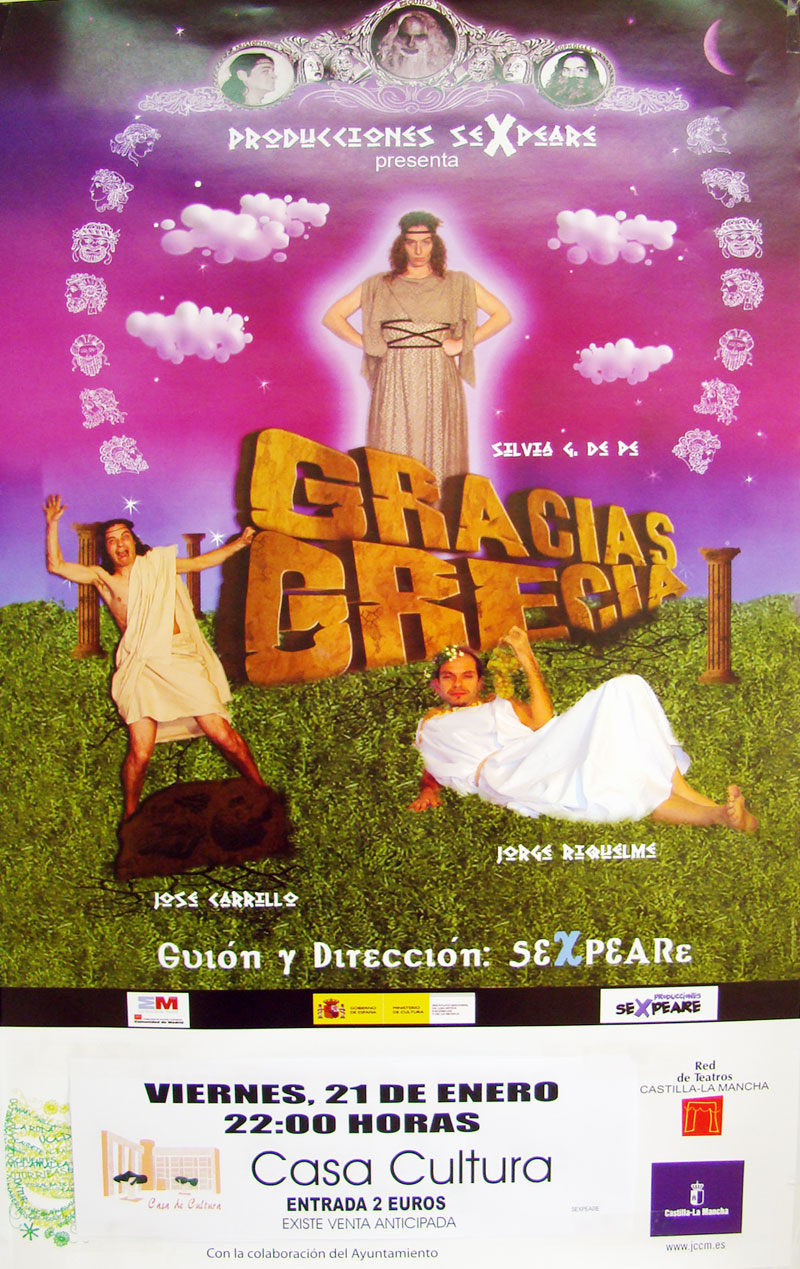 Dentro de la Red de Teatros de la Junta de Comunidades de Castilla La Mancha y a través del Área de Cultura del Ayuntamiento de Miguelturra el viernes 21 de enero a las 22 horas y por tan sólo 2 euros podremos contemplar una gran obra cómica de Producciones Sakespeare llamada "Gracias Grecia".