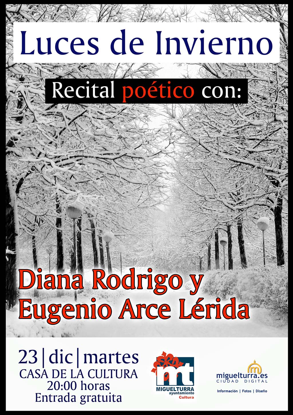 Dentro de la programación de Navidad 2014 que el Área de Cultura está desarrollando en nuestra localidad durante estas fechas hoy martes 23 de diciembre, a partir de las 20:00 horas en la Casa de la Cultura, podrán asistir al recital poético "Luces de Invierto" en el que intervendrán Diana Rodrigo y Eugenio Arce Lérida.