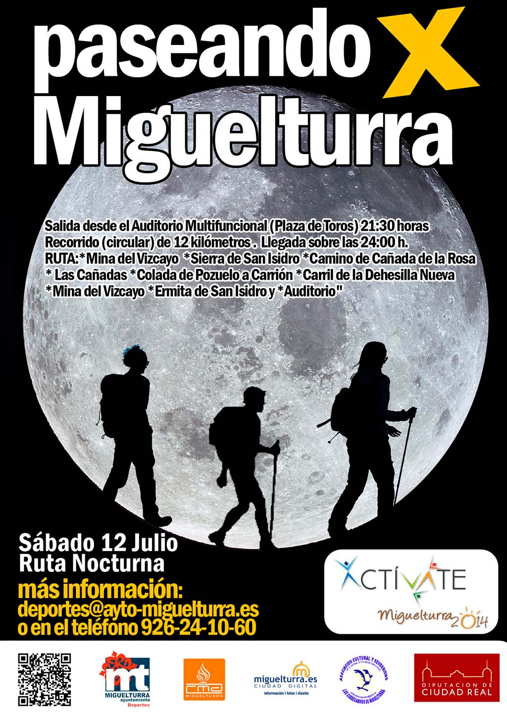 Con motivo del periodo veraniego el programa "Paseando por Miguelturra" tiene previsto una ruta nocturna, para así continuar promocionando el deporte y sobre todo, el deporte popular como ocio, actividad también enmarcada dentro del plan de eventos de este verano 2014 llamado "Actívate 2014", organizada por la Concejalía de Deportes de Miguelturra, en colaboración con la Asociación Cultural y de Senderismo "Los Correcaminos", Diputación Provincial de Ciudad Real y portal web municipal www.miguelturra.es.