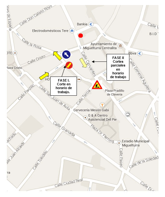 En una segunda etapa, será el entronque de calle Cervantes el afectado, por lo que el aparcamiento en la zona será provisionalmente cerrado y habrá cortes puntuales de Cervantes en horario de trabajo (07:30 horas a 15:00 horas), estando el vial abierto el resto del día con normalidad.