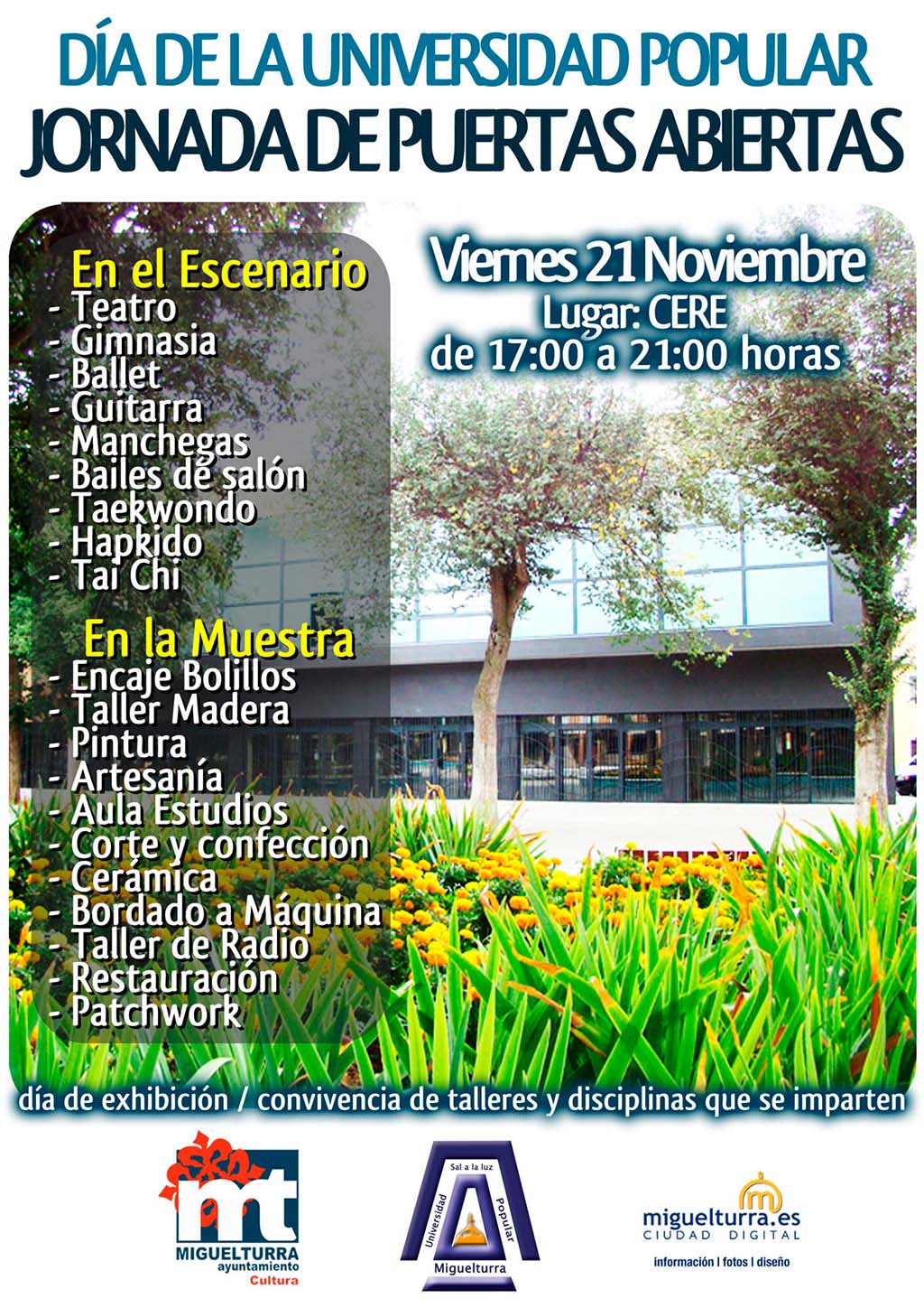 Este viernes 21 de noviembre la Universidad Popular de Miguelturra, dependiente del Área de Cultura del Ayuntamiento, realizará la segunda edición de "Jornada de Puertas Abiertas" a partir de las 5 de la tarde en el CERE (ubicado en el Parque Doctor Fleming).