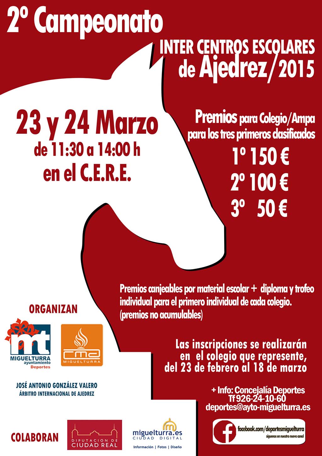 Este Campeonato de Ajedrez está dirigido a alumnado entre 6 y 16 años de los centros educativos de Miguelturra además del Instituto de Enseñanza Secundaria Campo de Calatrava, cuyas inscripciones están abiertas desde el pasado 23 de febrero y concluirán el 18 de marzo inclusive, y que se desarrollará en el CERE de Miguelturra entre las 11:30 y las 14:00 horas, con premios para el colegio y AMPA para los tres primeros clasificados.