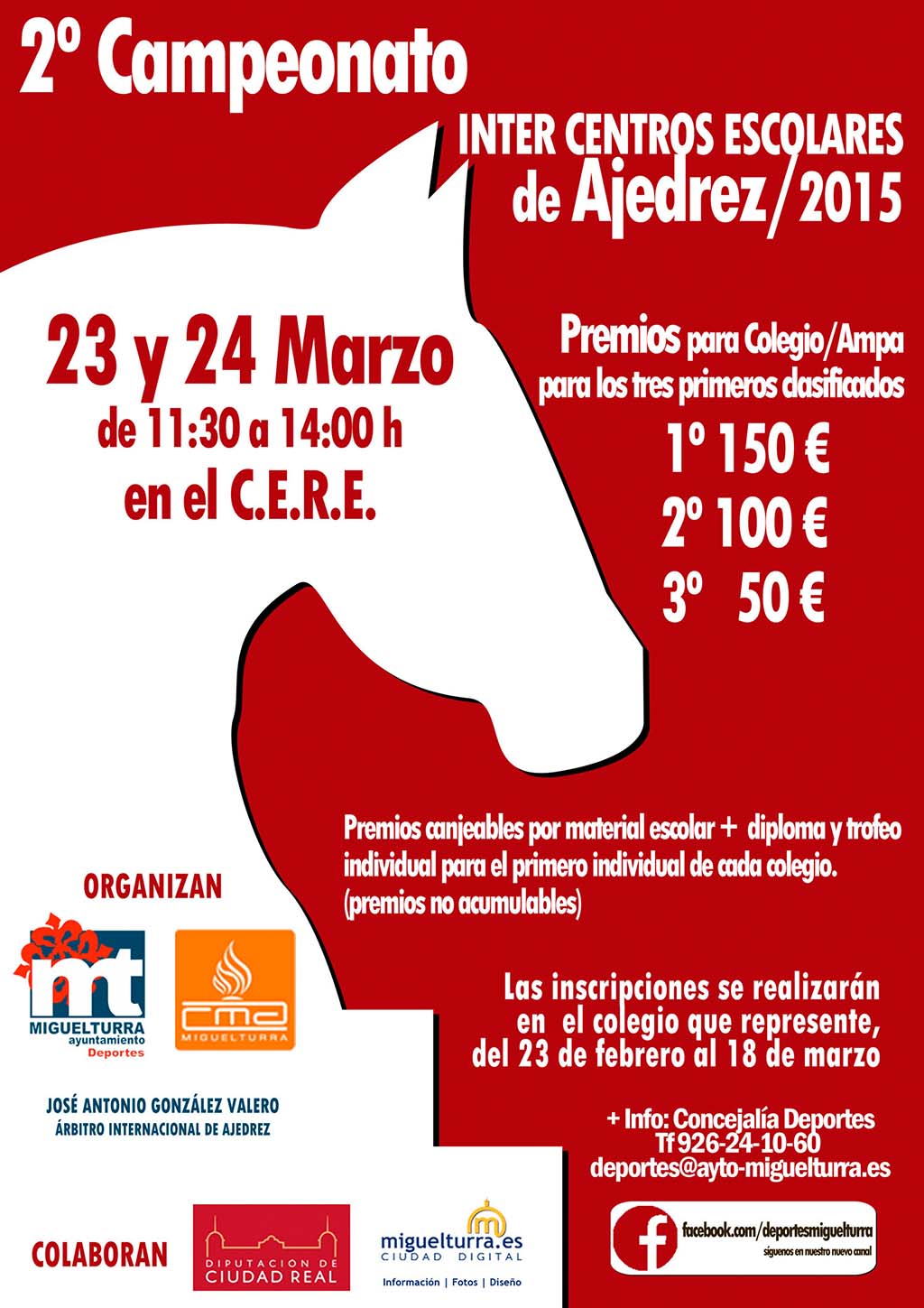 El Área de Deportes del Ayuntamiento de Miguelturra y el árbitro internacional de ajedrez José Antonio González Valero, contando con la colaboración de la Excelentísima Diputación Provincial de Ciudad Real y www.miguelturra.es, organiza el Segundo Campeonato Inter Centros Escolares de Ajedrez, que se desarrollará en Miguelturra los días 23 y 24 de marzo, lunes y martes respectivamente.