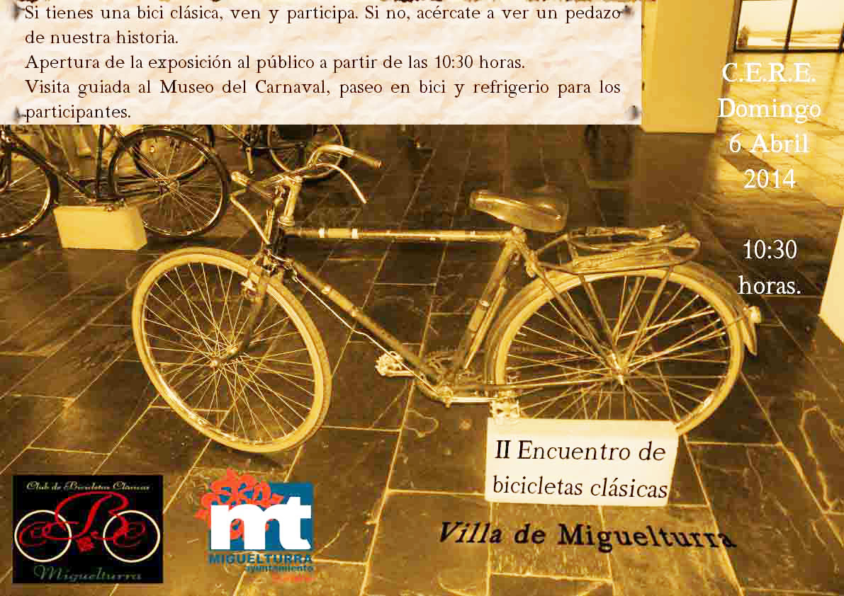 El Club de Bicicletas Clásicas de Miguelturra, con la colaboración del Área de Cultura del ayuntamiento, celebra el segundo encuentro de bicicletas clásicas y antiguas Villa de Miguelturra, en el que podrán participar todas aquellas personas que posean bicicletas antiguas y con características peculiares.