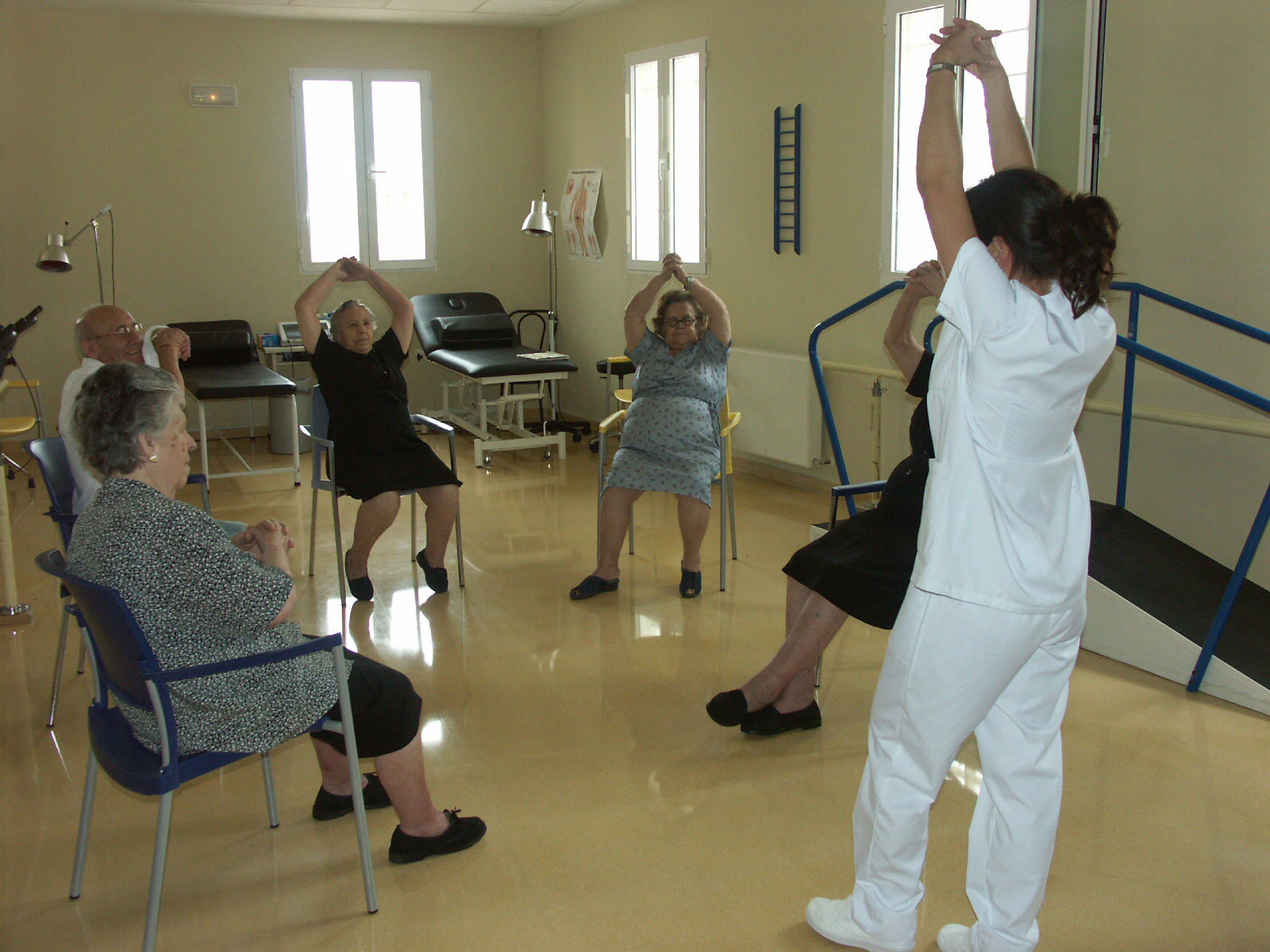 En Fisioterapia: asistencia terapéutica, realizando labores de detección, prevención, mantenimiento y tratamiento, aliviar en lo posible la sintomatología que presenten ya sea por una patología concreta o propia de la edad: Aparición de rigidez articular, pérdida de fuerza muscular, disminución de masa ósea, dolores articulares y/o musculares, disfunciones respiratorias y circulatorias, alteración del equilibrio y la coordinación, etc...